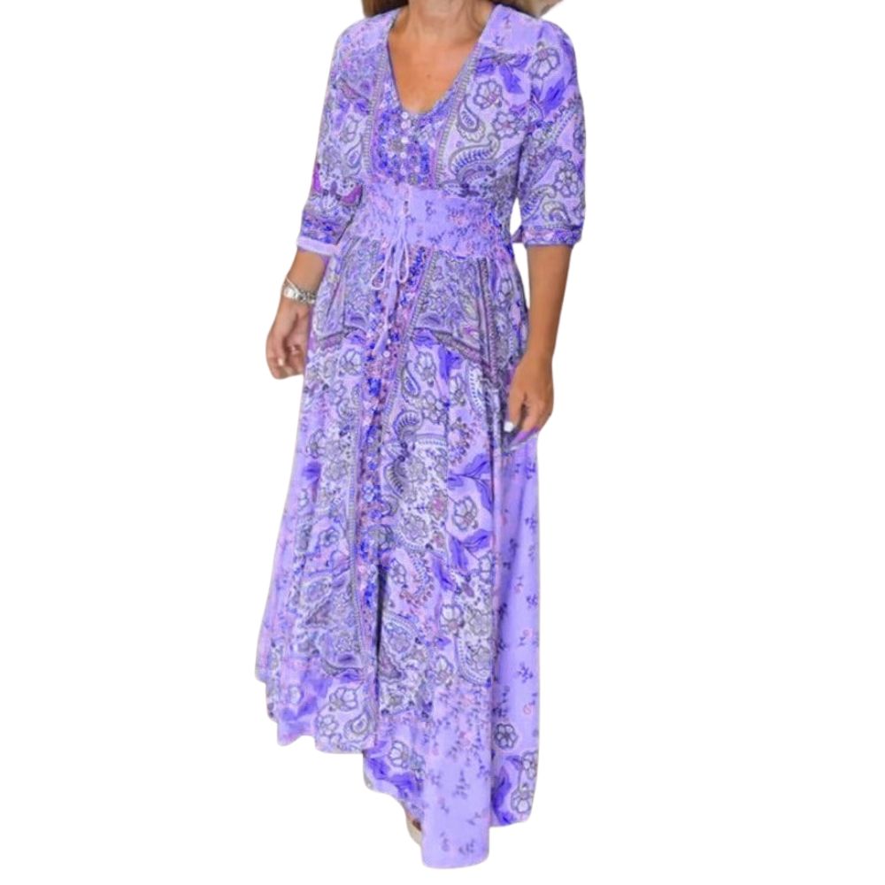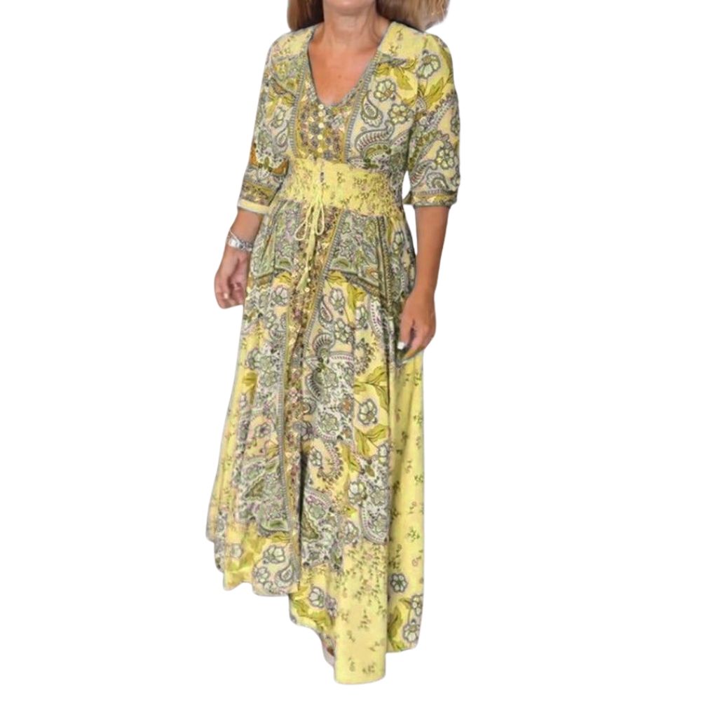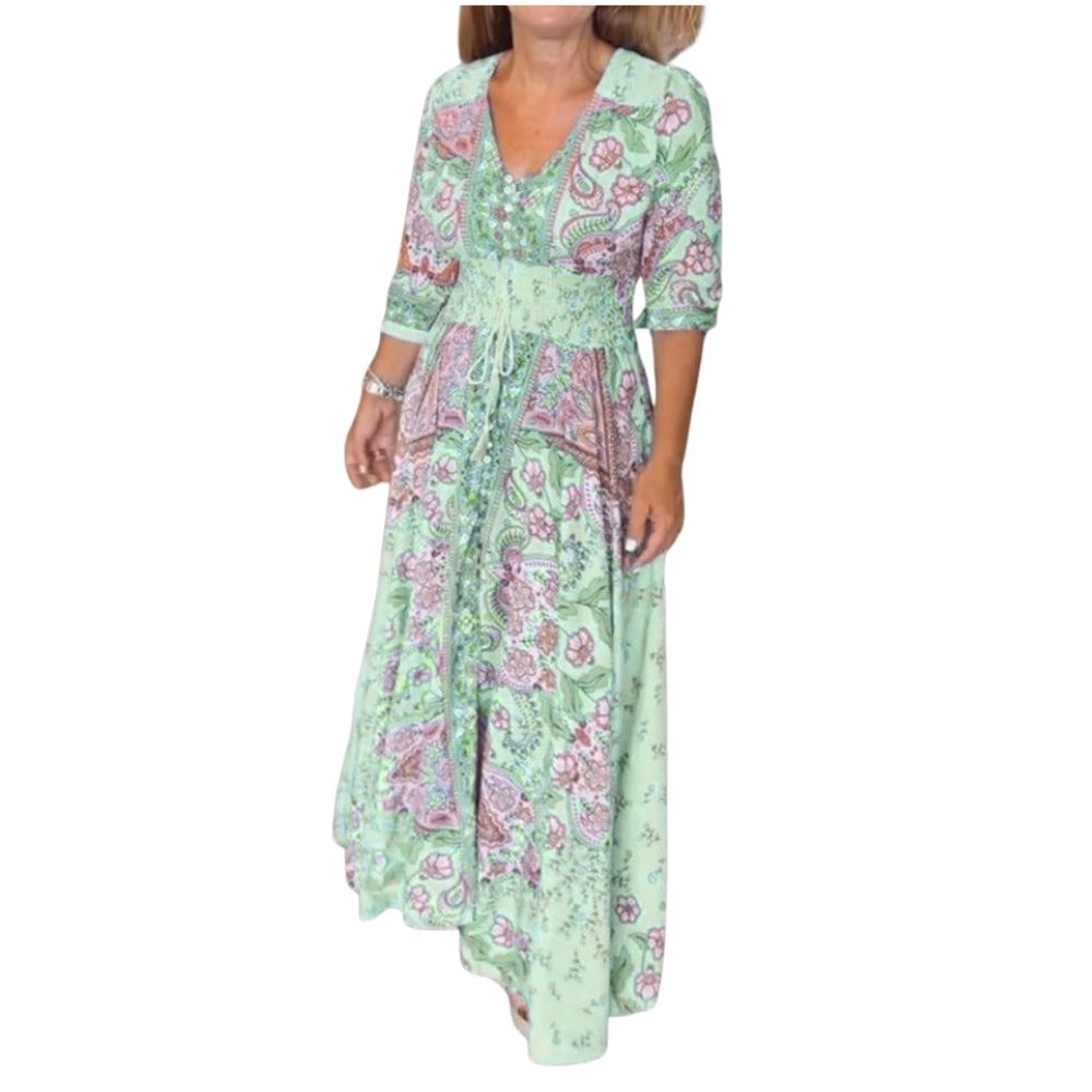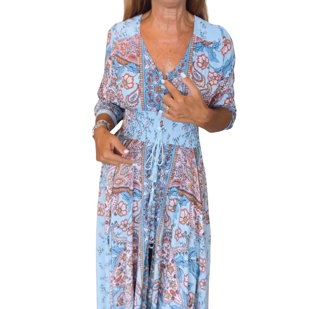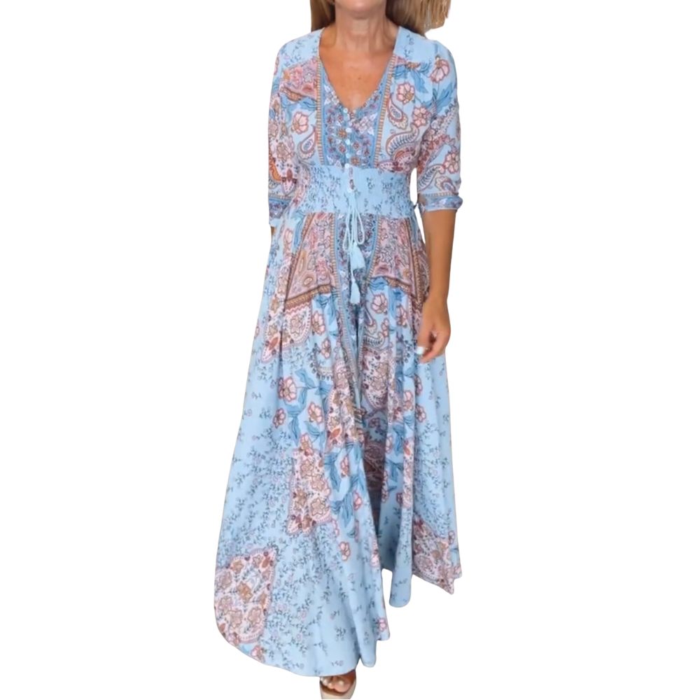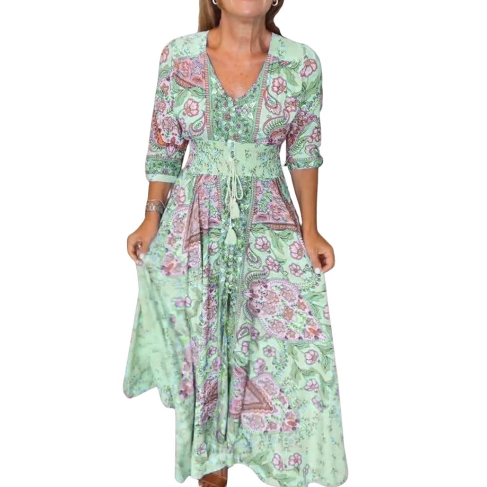 A flowing Monvy maxi designed for women who love comfort, elegance, and a touch of wanderlust. This lightweight 100% recycled polyester, ultra-soft fabric feels gentle on the skin and moves beautifully with every step. The detailed floral and paisley pattern brings a romantic, vintage charm, while the adjustable waist tie shapes the silhouette in the most flattering, effortless way. With a feminine V-neck and relaxed sleeves, it is perfect for beach walks, relaxed afternoons, or summer evenings with loved ones. A timeless, easy-to-wear piece that brings beauty and freedom to every day.