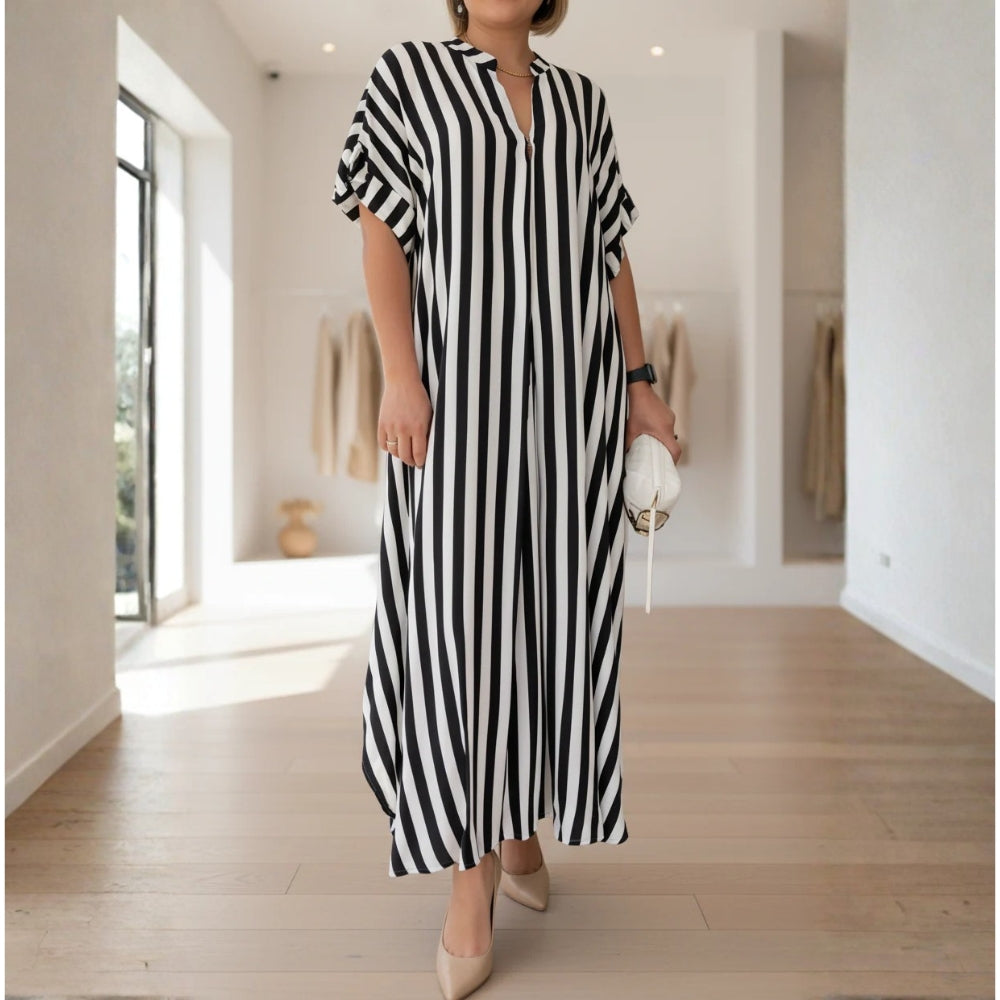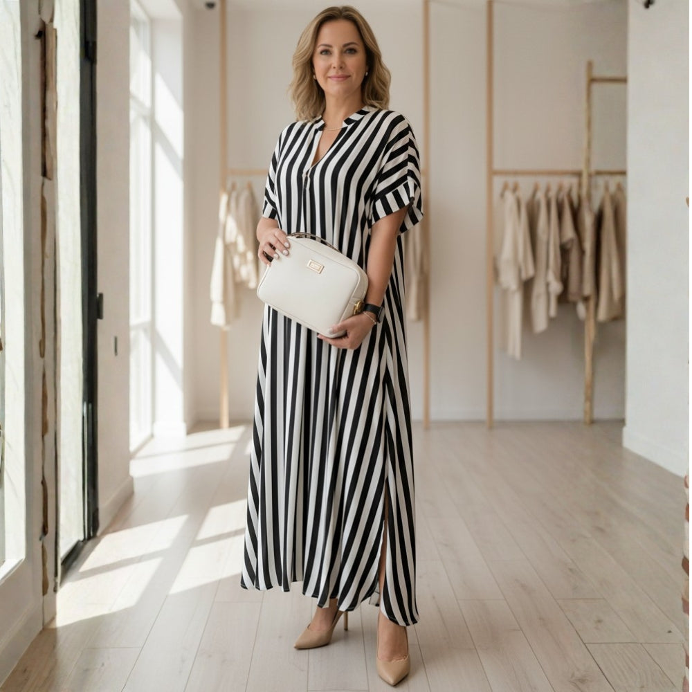 Meet Darlene™: a striking black-and-white striped maxi dress designed to bring timeless elegance and everyday comfort together. With its flowing, relaxed silhouette and bold vertical stripes, Darlene™ creates a beautifully elongated look while moving gracefully with your body. Effortless yet refined, this dress is made for women who want to feel confident, polished, and completely at ease. wherever the day takes them.